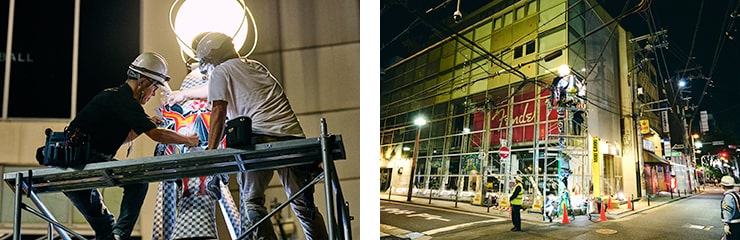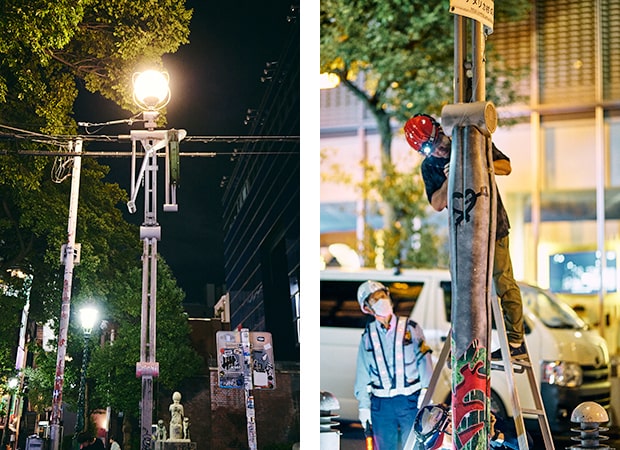 一方で、JOE、アワジトモミ、KICHIの作品については、イベントの事前に完成。細かく描かれた作品データを施工用フィルムに印刷し、職人さんたちが熟練の技で街路灯に美しくラッピングしていきました。平面だったデータが立体化し、新たなアートを纏った街路灯の姿は、まさに街の新たなシンボルです!