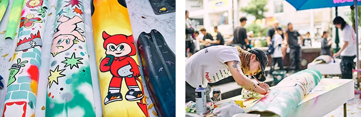 それから10年を経て、この街でのアートプロジェクトが今年2025年に再始動。『Red Bull Reignition』の名のもと、50基の街路灯のうち5基をリニューアルすることになりました。今回参加したアーティストは、アメリカ村の会推薦のJOEとSHUN NAKAO、FM802推薦のアワジトモミ、そしてMARZELキュレーションによるIBUとKICHIの5人。それぞれが独自のスタイルを持ちながらアートシーンで活躍を続ける面々です。