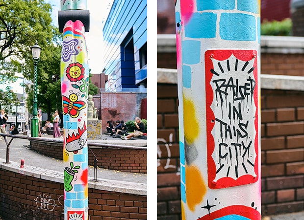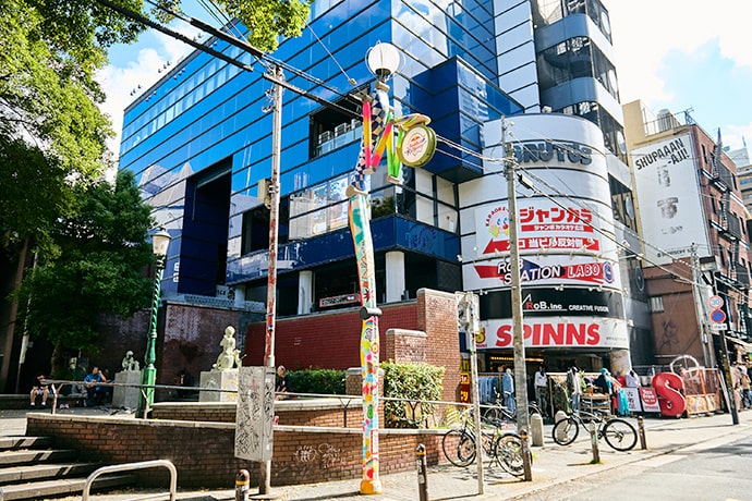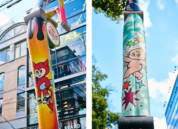 初めて来たのは中学生の頃でした。実家が豊中で、親からは「アメ村は中学生になってから!まだまだ早いから、それまでは梅田を越えたらアカンで」って言われてたんですよ。それが解禁されて中学生になってからは、古着屋やアメリカントイのお店によく通ってましたね。三角公園には今でもよく集まってるし、スケーターの友だちができたり、ここからクラブに流れて知り合いがたくさん増えたり、私にとってはいろんな出会いが始まった場所。しかも今回担当させていただいた街路灯が三角公園にあるので、昔から遊んでた場所に残せるのは本当にアツいことだと思ってます。