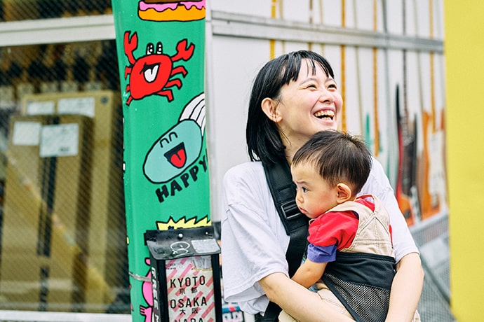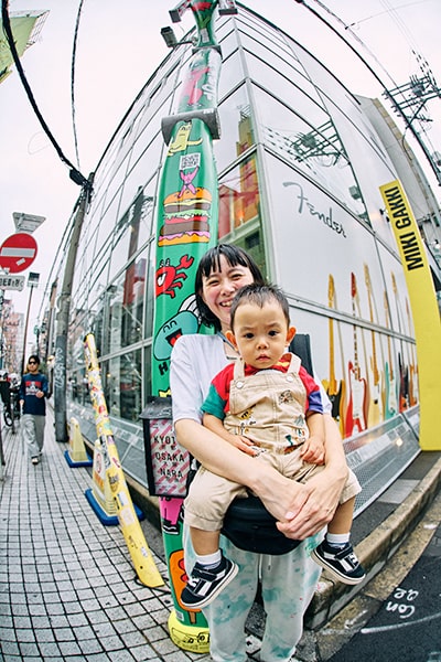 それって、“慣れ”もあるかもしれませんね(笑)。昔から変わらずいいお店はあるし、アメリカ村に入ってみると、やっぱりいろんなカルチャーを体感できますし。今日は息子さんも来てくれてますが、成長するにつれてアメリカ村へ一緒に遊びに来る機会も増えるんじゃないですか?アワジさんの絵を見に来たり、古着を買いに来たりとかで。