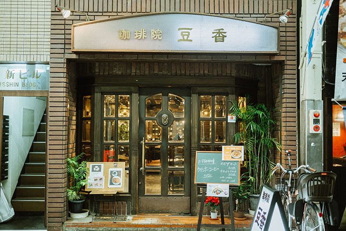 お邪魔したのは、『珈琲院 豆香』。古き良き昭和の喫茶店といった雰囲気のお店です。「この商店街、めっちゃ喫茶店多いんですよ。路地も合わせたら10軒以上はあると思います。コーヒー全然詳しくないですけど、でもお店によってぜんぜん違ってて。近くにある伊吹珈琲店はストロングスタイルで、マイルドでもほかの店のストロングより煎ってます。麗門ってお店は大バコなんですけど、そこもすごい雰囲気が良くて」。豆香にはもう10年ほど通っているという小西さんですが、店名の読み方はいまだにわからないそうです。