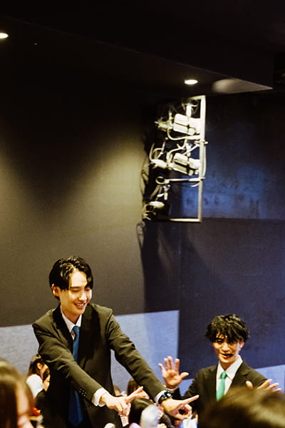 ハマー:僕は恥ずかしいので、生き別れた双子の体でいこうかなって迷い中です。今日は竹内涼真さんをイメージして顔にホクロを足したんですが、こんな風に別人格としてアイドルをやれたら恥ずかしさもなくなるかなって。例えば、カベポスターの浜田はお客さんと絶対に目を合わせないけど、ハマーは絶対に目を合わせるとか。今日はお客さんの顔を見てたら途中で照れちゃって、キャラを降りてしまったという反省点はありますね。もっとハマーという別人格に入り込めたら、パフォーマンスも上がるのかなと思います。