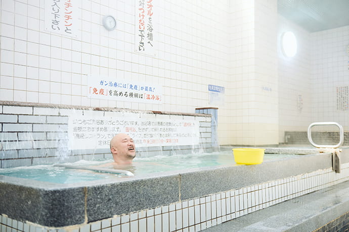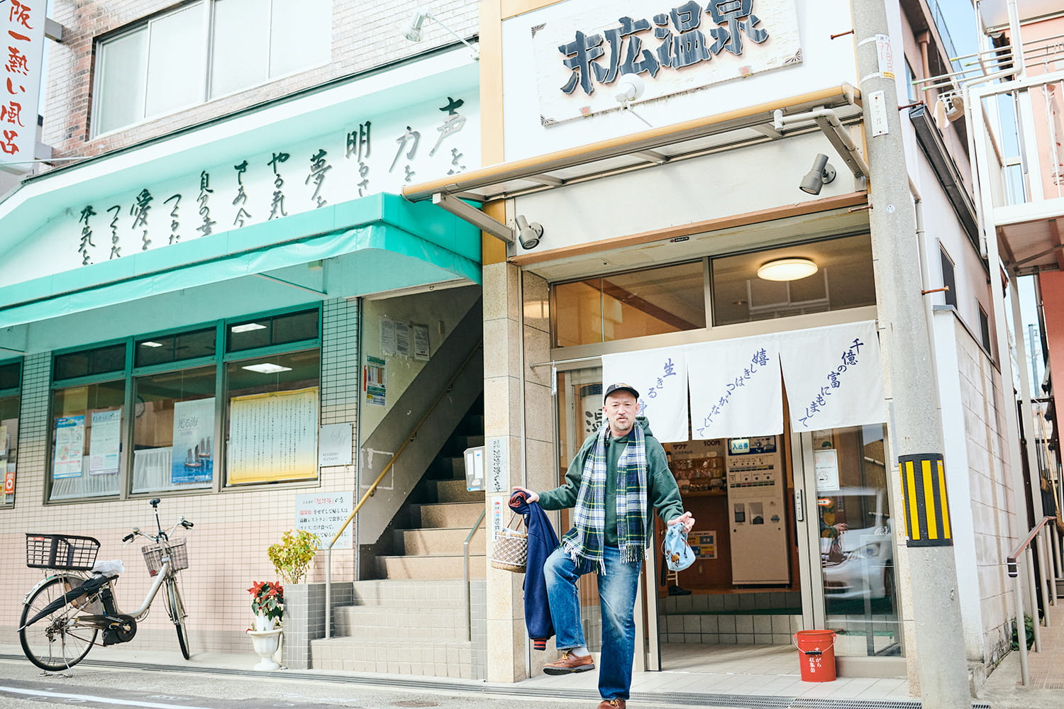 牧田さんと待ち合わせしたのは、大阪市平野区にある『末広温泉』。「大阪一熱い風呂」を称し、西式温冷浴という入浴法を推奨している銭湯で、風呂好きの方々からは聖地として崇められている場所です。「ここは生まれ育った地元エリアにある銭湯で、いわば氏風呂(うじぶろ)みたいなもの。小学生の頃も何度か行ってたんですよ」と牧田さんは言います。