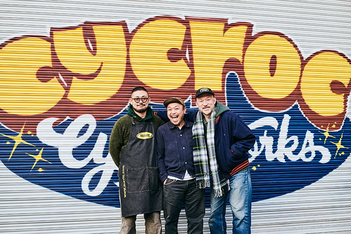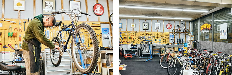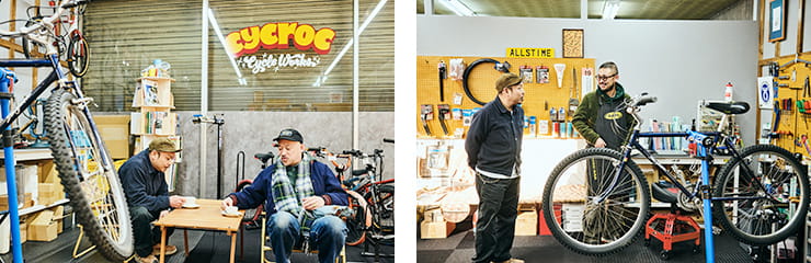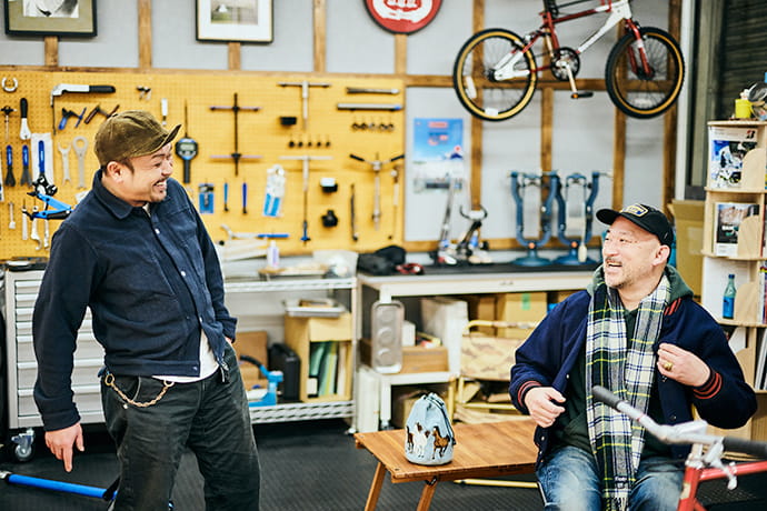 会社の一部を改装して作られた桶美さんの『cycroc cycle works』では、日々のメンテナンスもOKで、kuwaharaのBMXなどもズラリ。コロナの影響で生産を止めていたオリジナルの<FLAT1>は問い合わせが多く、「また違う感じで生産しようと思ってるんですわ」と桶美さん。