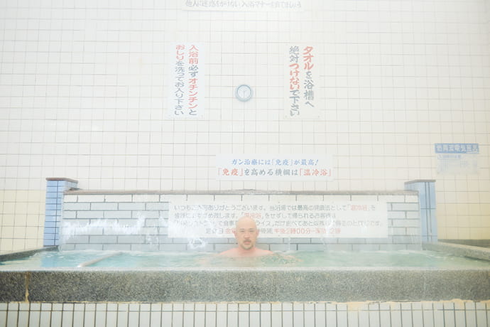 「14年前くらいかなぁ。桶美と知り合って仲良くなり、そこから風呂を“掘る”ようになったんですよ。レコードを“掘る”ような感覚で、ナニワ工務店(※)が施工した銭湯に片っ端から行って、その中で再会したのが『末広温泉』やった。それで温冷浴をしたら気持ち良すぎて、取り憑かれてしまったんですよ(笑)」