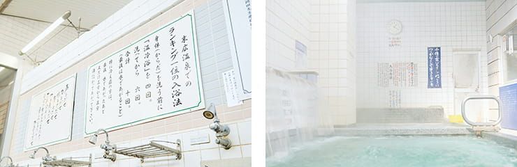 『末広温泉』の魅力は「やっぱり湯の温度と天然地下水の水風呂のバランスが最高!この温度管理が完璧なんよ。いろんな友だちを連れてきたけど、熱い湯や水風呂が苦手だったヤツらも、最後には「マジで最高っすね」って言うてるから(笑)。しかも水風呂も2箇所あるのがエエねん」とのこと。浴場内の壁面には入浴法やたくさんのメッセージが描かれており、読んで実践するのはもちろん、読んで心を洗えるのも『末広温泉』らしさだと教えてくれました。