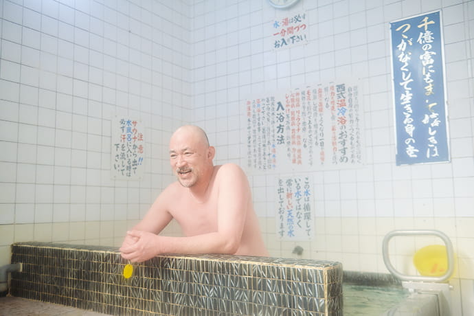 今日は撮影ということで、一番風呂に入らせてもらいました!先に述べた西式温冷浴とは、昭和時代の医学博士・西勝造さんが推奨した西式健康法の中にある入浴法で、熱い湯と水風呂を1分ずつ交互に繰り返して入るもの。『末広温泉』の先代社長・井上さんが感銘を受け、湯温を45度、天然地下水による水風呂の水温を20度に設定し、独自の健康法として推奨&伝承しています。