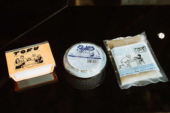 海外の豆腐って、パッケージがすごくおしゃれなんですよね。スーパーに並んでいるだけで、ちょっとした絵になるというか。それに、僕自身は子どもの頃から“ヨーグルトや牛乳=青”というイメージがあって、色で食材を認識していたところがあるんです。だから、豆腐もカラフルな存在として印象付けられたら面白いんじゃないかなと考えました。デザインをお願いしたのは、イラストレーターのTakeshi Wadaさん。僕の家族をモチーフに、サザエさんのようなタッチで描いてほしい、とオーダーしました。