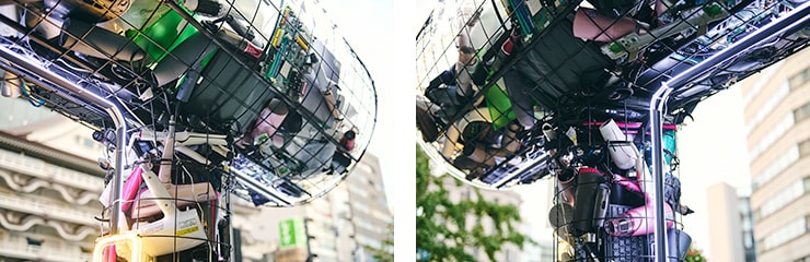 そんな『BEAUTY CYCLE PROJECT』をより多くの人に知ってもらうために、9月23日(火)から9月28日(日)まで、大阪・御堂筋の難波エリアに巨大ドライヤーオブジェが登場しています。高さ3mもあるこのオブジェ、よ〜く見てみるとドライヤーの中にはたくさんの捨てられるはずだった小型家電が入っているんです。