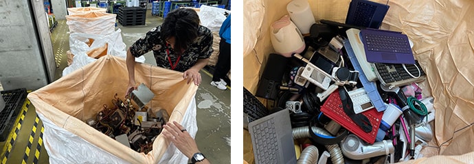 そんな“都市鉱山”を目の前にして、ヅカデンを代表して参加したロビンさんの目もキラリ。今回のオブジェ製作に利用する、捨てられるはずだった小型家電をピックアップしていきます。集めたのは約1m四方の大きな袋2つ分!再利用される前に、『BEAUTY CYCLE PROJECT』でも活躍してもらいます。