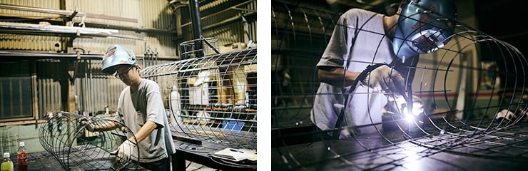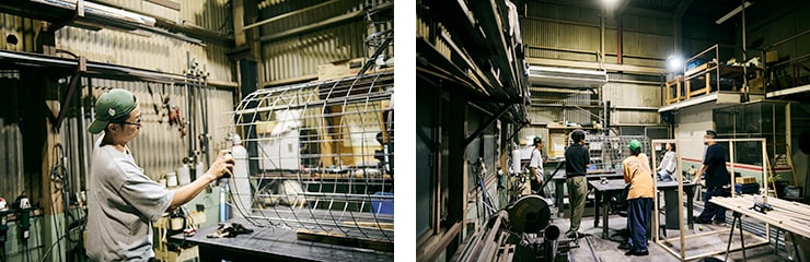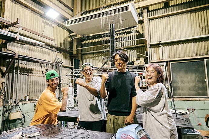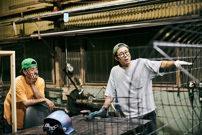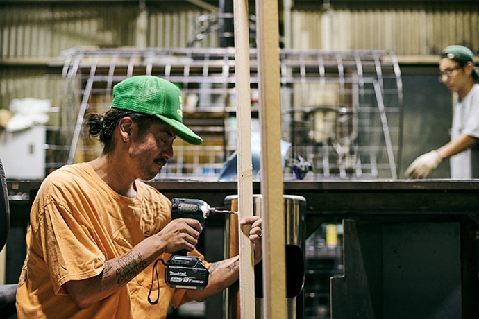 そして、巨大ドライヤーオブジェの骨組みと土台を担当したのは、アイアンのプロフェッショナルでもあるgump・神立さんと、店舗からイベントまでお任せの大工として人気のBEEF OR CHICKEN・藤本さんです。製作はgump・神立さんの工房で行われ、アイアンを使ってドライヤーの形状が作られていきます。