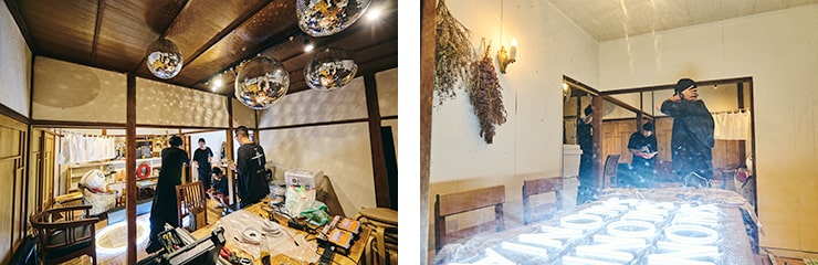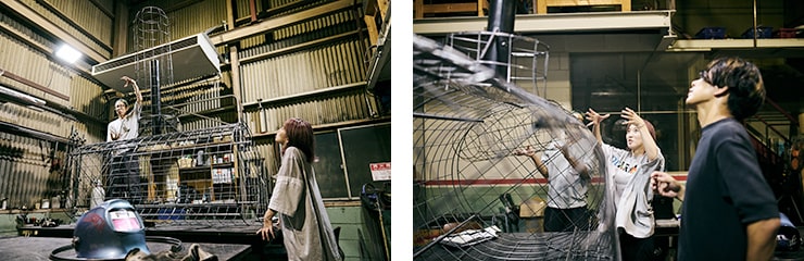 この日は9月20日で、オブジェの設置まであと3日。<SALONIA>チームから松川さんと岸本さんもアトリエに訪れ、遅くまで細かな作業の打ち合わせを続けていきました。