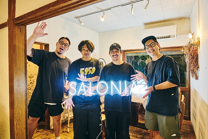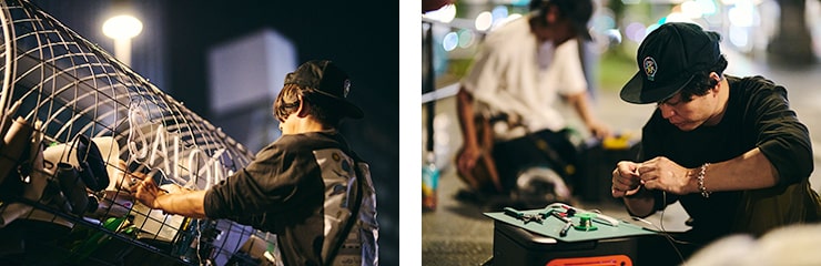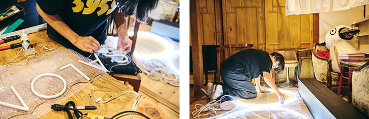 小型家電に再利用前の役目を与えた後は、ネオンサインの設置へ。ロビンさんと真純さん、山岡さんが、ドライヤーの形状をわかりやすくするためのネオンを配しながら、<SALONIA>ロゴのネオンサインを設置していきます。最後はBEEF OR CHICKENの藤本さんが土台に蓋をして、塗装調整を加えて…。