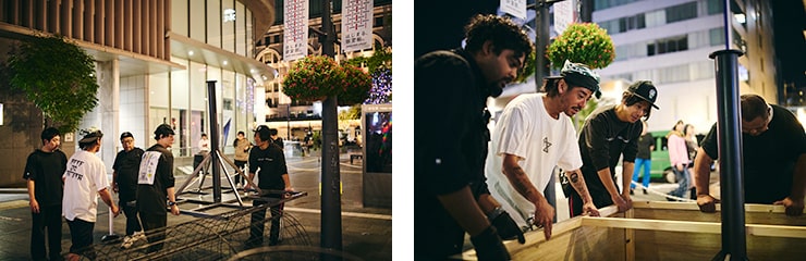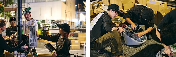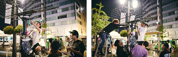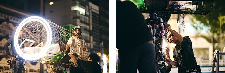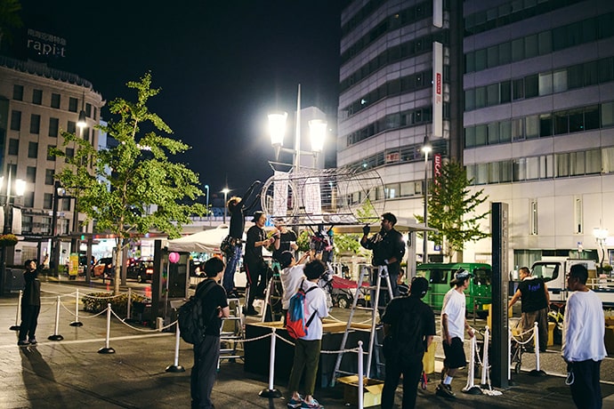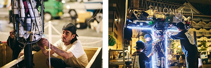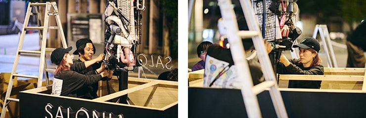 いよいよオブジェ設置の当日です。9月23日(火)午前0時から作業がスタート。大きなオブジェと中に入れ込む小型家電を荷下ろしして、ヅカデンのロビンさんと真純さんと山岡さん、BEEF OR CHICKENの藤本さんが細かく指示をしながら設置していきます。23日が祝日ともあり、界隈は深夜でもまだまだ賑やかな様子。通行する人たちも「わ!ドライヤーだ!」「SALONIAだ!」とつぶやいていて、興味津々です。