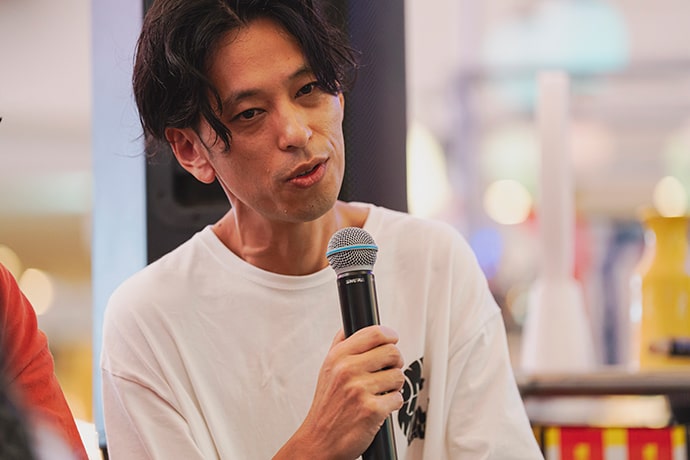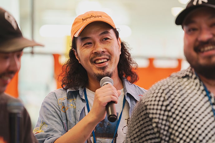 「新港第一突堤」を担当するダイゴロウさん。「これまでは民謡クルセイダーズやSATTU CREWなど、ごはんに合うような、土着的なにおいのするアーティストを呼ぶことが多かったんです。でも今回はせっかくの機会なので、ブジウギ単体だったら好きでも声をかけなかったかもしれないPARKGOLFやテレビ大陸音頭にも出演をお願いしました。この機会に、ほかのフェスのファンの方にもブジウギを知ってもらえたらと思っています」