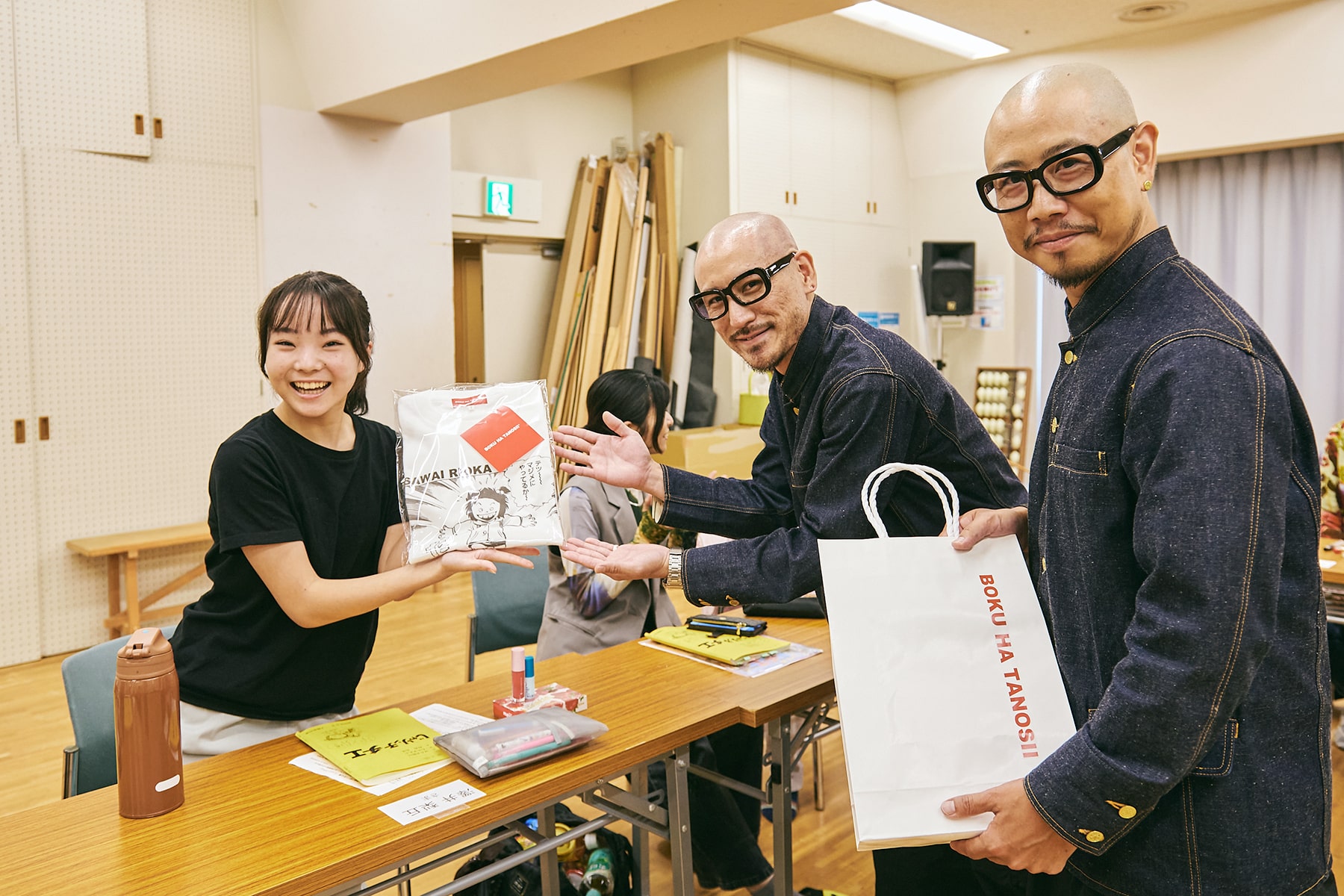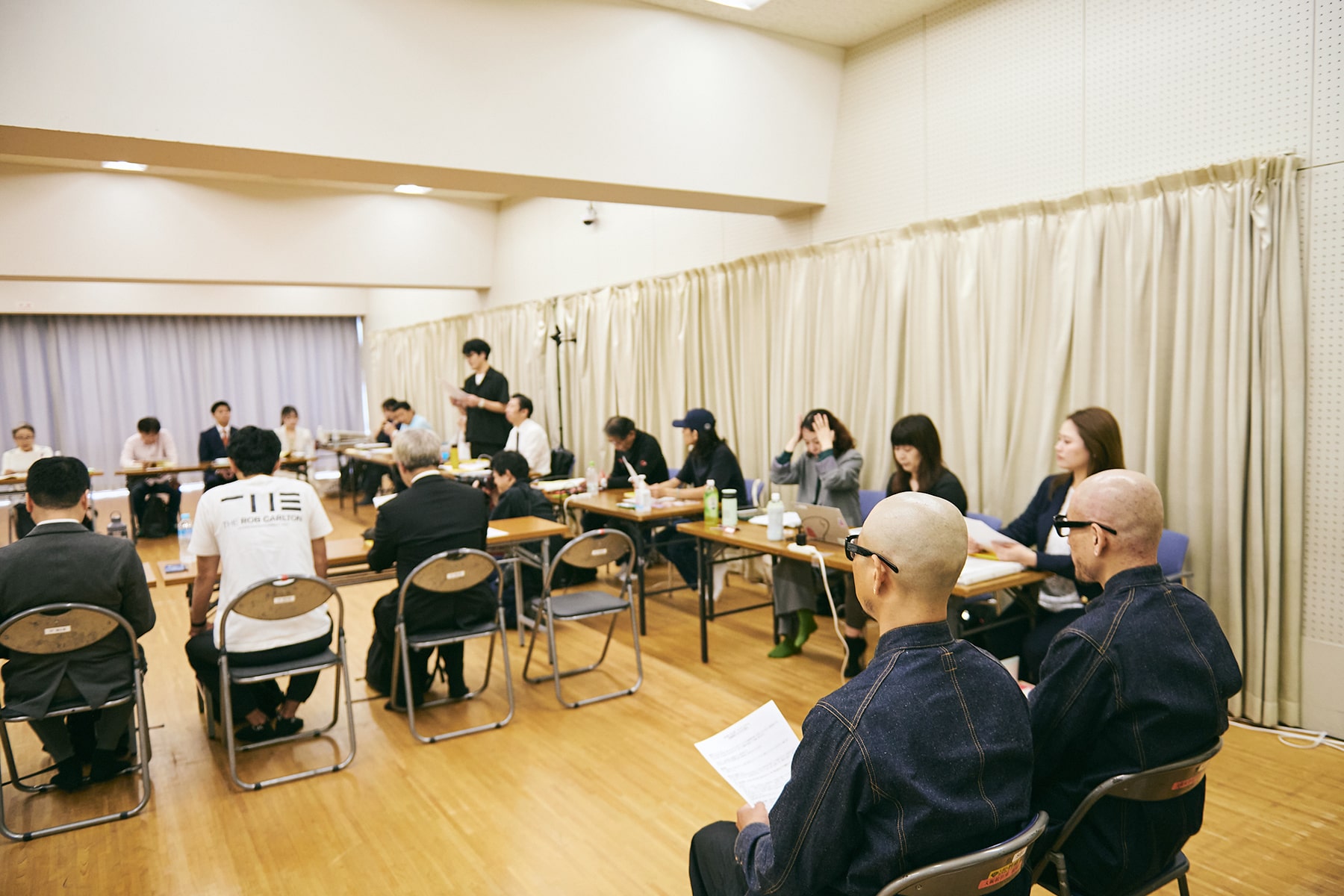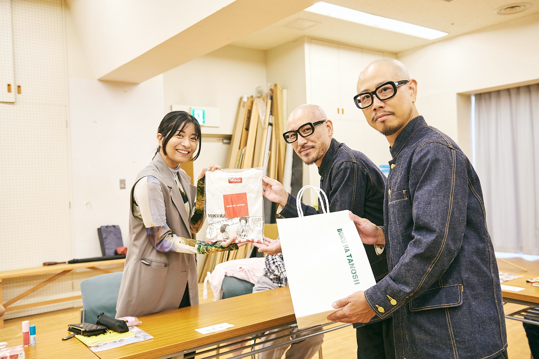 稽古終了後、出演者が一息ついたタイミングで、TMCのお二人から稽古着Tシャツをプレゼント。主人公・竹本チエ役の澤井梨丘さんをはじめ、竹本テツ役の波岡一喜さん、竹本ヨシ江役の三倉茉奈さんなど、15名の出演者に贈られたTシャツは、なんと「洗い替え用に」と2着ずつ。そのさりげない心遣いに、稽古場が笑顔で満たされました。