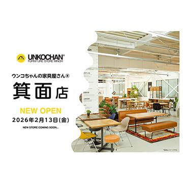 ユニークな名前と良質なファニチャーでお馴染みのウンコちゃんの家具屋さんが、2月13日に箕面店をNEW OPEN!