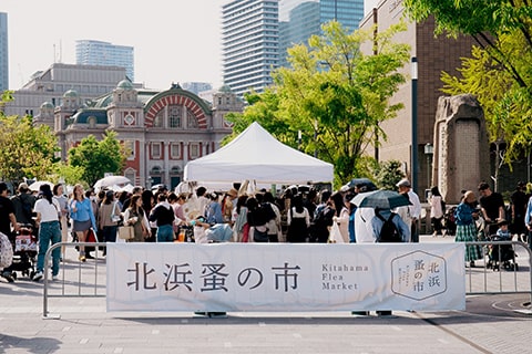 「北浜蚤の市」は2018年にデザイナーやスタイリストらの呼びかけから始まった小さな市が原点。今では器やアクセサリーなどの作家もの、グリーンやドライフラワー、ビンテージ雑貨や古着、北欧ファブリック、そしてパンや焼き菓子といったフードまで、個性豊かなラインナップがそろいます。今回は土曜と日・月曜(祝日)で出店者が総入れ替えとなり、約130店が参加予定。秋の中之島に多彩なマーケットの景色を描き出します。