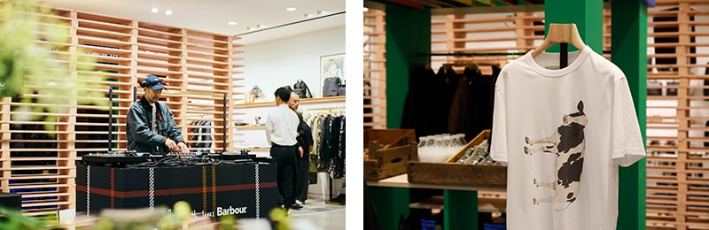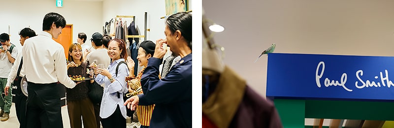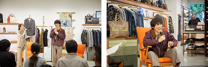「Paul Smith Loves Barbour」のアイテムをまとった千原ジュニアさんは、「バイク好きにも嬉しい仕様で、ディテールにすごくこだわりを感じますね」とデザインに対する見解を話したり、特徴的な裏地を指さして「結局、大人は裏地なんですよ!」とポール・スミスの遊び心にも共感。ご自身のライフスタイルやファッション感についても話していただき、素敵なトークセッションが繰り広げられました。