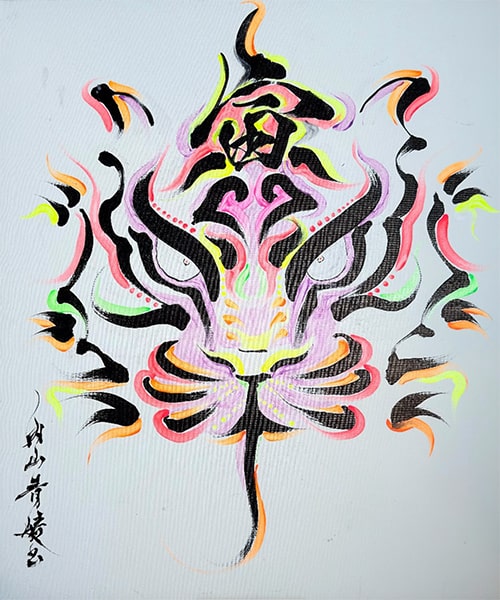 近年の個展「言霊」では、願いや祈りを「一文字」に凝縮し、すべてをポジティブな言葉として昇華させた作品を展開している。また、ダルマなどの立体物に書を施すことで、平面から立体へと表現を拡張し、さらには音楽やダンスと融合させたライブパフォーマンスを通して「影と光」「憤怒」といったテーマを、筆と身体を駆使して描き出している。