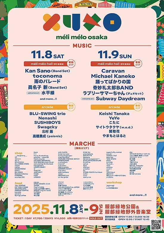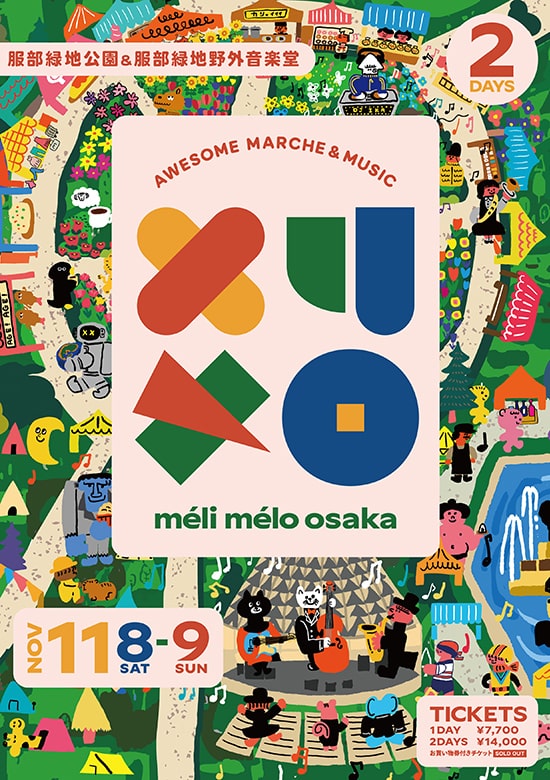 関西最大級のローカルカルチャー博「méli mélo osaka(メリメロ)」が、11月8日(土)・9日(日)の2日間、服部緑地公園と野外音楽堂で開催されます。緑に囲まれた会場には、雑貨・フード・ワークショップなど100店舗を超えるマーケットが大集結し、アーティストライブは20組以上がスタンバイ。関西のカルチャーをぎゅっと詰め込んだ2日間になりそうです。