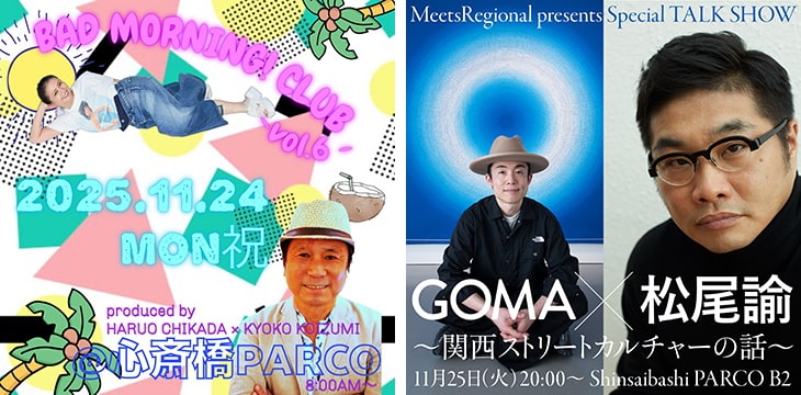 また、雑誌Meets Regionalによる関西カルチャーを語るトークイベント「GOMA×松尾諭」や、関西発のWEBメディアMARZELの5周年を記念した「MARZEL 5th ANNIVERSARY PARTY」もラインナップ。地元とともに進化してきたPARCOらしい、共振的な企画が並びます。