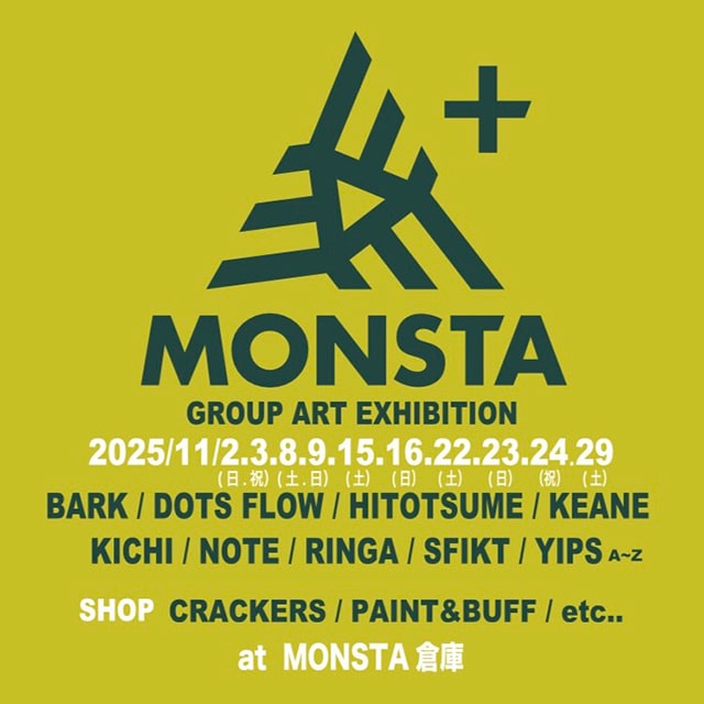 KICHIやHITOTSUMEをはじめ、活躍の領域を拡張し続ける9名のグラフィティライター&ペインターのグループ展「MONSTA+」が開催。今回の展示では、普段は作業場や倉庫として使用し、一般公開不可となっているMONSTA倉庫を期間限定で開放するという貴重な機会にもなっています。