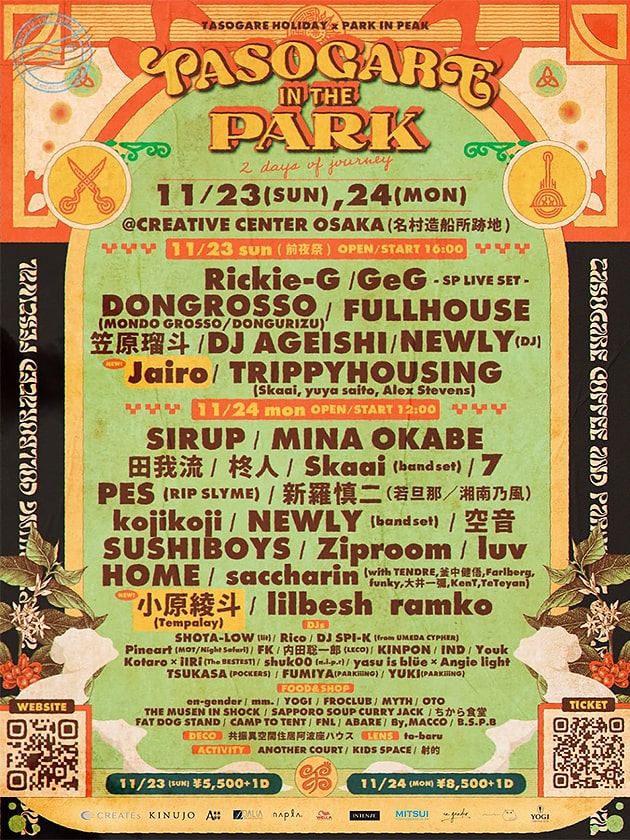 11月23日(日)&24日(月・祝)の2日間にわたって開催される気になるラインナップは、SIRUP、 柊人、Rickie-G、GeG、MINA OKABE、田我流、PES(RIP SLYME)、新羅慎二(若旦那/湘南乃風)、saccharinなどなど、スゴイ面々が勢揃い。もちろんフードブースやDJ陣も超強力で、高感度な2日間になること確実だから、この連休は「TASOGARE IN THE PARK」に行っておくべきだと思います!!