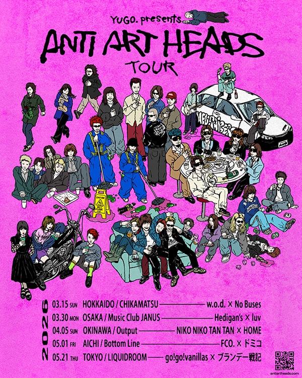 数多くのバンドのアートワークで知られるイラストレーター YUGO. がプロデュースする新感覚ツアー「ANTI ART HEADS / TOUR」が発表されました。YUGO. が会場ごとの空間演出を手がけ、札幌・大阪・沖縄・愛知・東京の5都市のライブハウスを巡るこのツアーは、各地のバンド(各公演2マン)を迎えつつ“アートとロックの融合”を体験できるイベント。ツアービジュアルからも伝わるように、ライブの熱量とビジュアルの強度が同時に楽しめる仕掛けになっています。