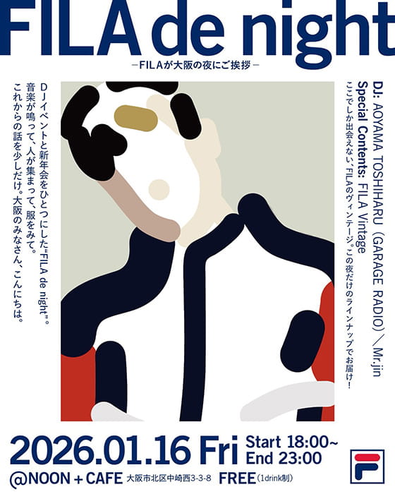 大阪ロックDJ界の重鎮・AOYAMA TOSHIHARU、元祖歌謡曲ナイトを主催するMr.jinといったDJ陣がプレイし、フロアではスペシャルコンテンツとして<FILA>のヴィンテージアイテムの展示&販売も行われるそう。音楽で踊り、人と出会い、服を楽しむ「FILA de night」で、大阪の夜に生まれる新たなグルーヴを体感してください!!