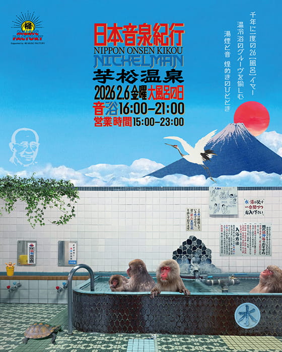 また、リリースされる2026年2月6日(金)<大風呂の日>には桶 MUSIC FACTORYのサポートのもと、京都の名銭湯でもある芋松温泉にてリスニングイベントも開催!浴場内にて「日本音泉紀行」をじっくりと楽しみながら、芋松温泉の湯と水を存分に味わってください。当日は12inchアナログ&カセットテープ、ポスターの物販もあるので、ぜひ!!