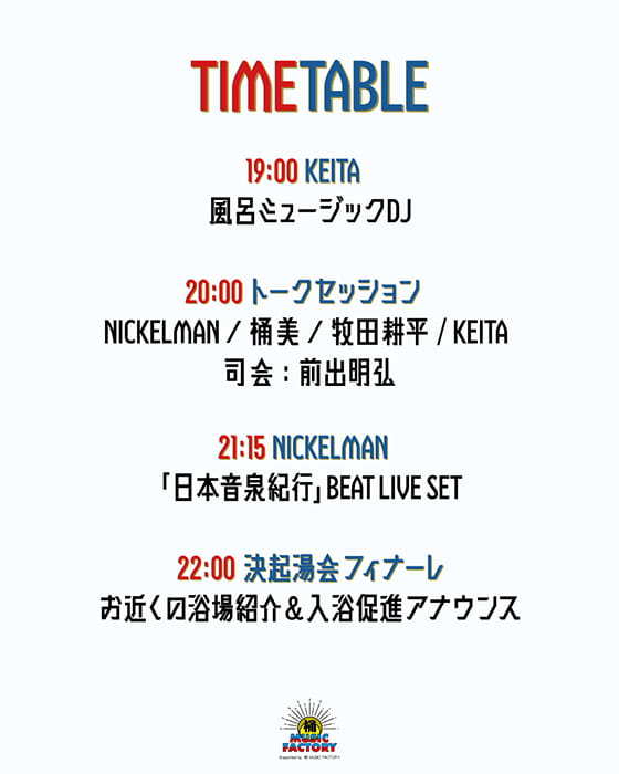 当日は、関西最大級の無料HIP HOPフェスをオーガナイズするKEITAの風呂ミュージックを愉しみながら、桶 MUSIC FACTORYの桶美&THE UNIONの牧田耕平の2人も参戦する風呂トークセッション、そしてNICKELMANによる「日本音泉紀行」のビートライブセットというラインナップでお届けします。また、アルバムの12inch LP・カセットテープや、会場限定ポスターの先行発売も予定!!