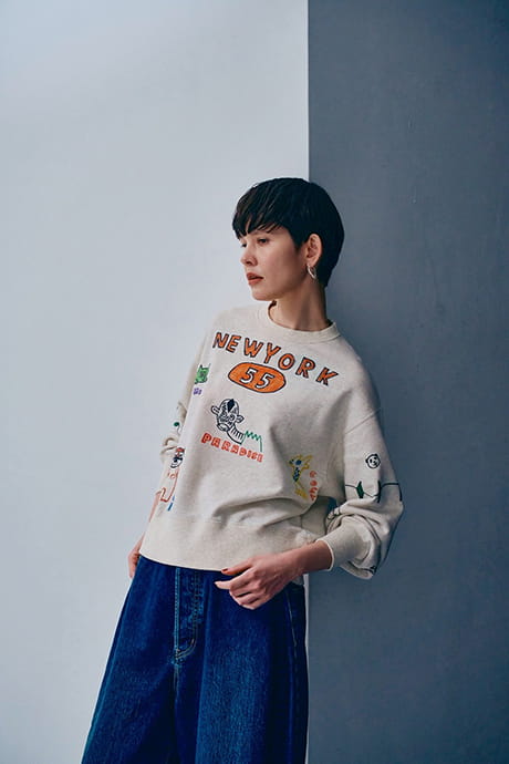 ブランドが素材から拘って仕立てたオリジナルボディに、『十四才』店主・塩見氏が一点一点手作業でアートワークを施した特別な一着。ボディには軽さと柔らかさを追求した30/10の裏毛素材を使用し、杢目の表情がイラストに映えるカラーをセレクト。カジュアルになりすぎない、女性らしいシルエットに仕上がっています。