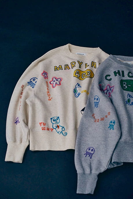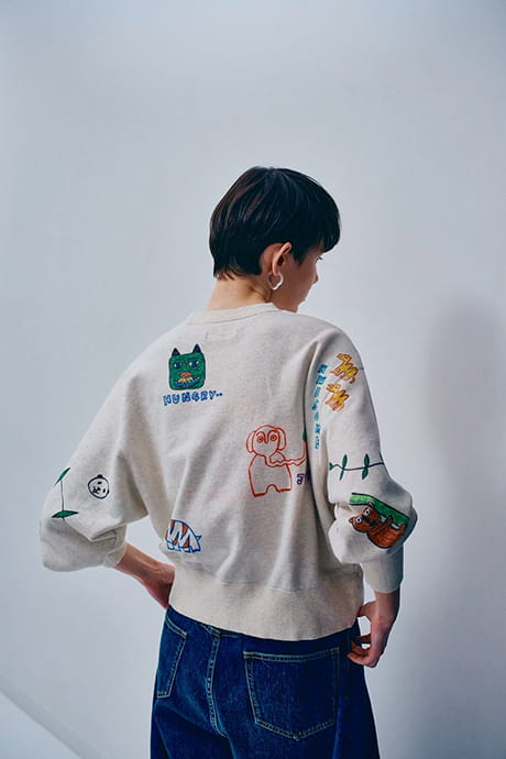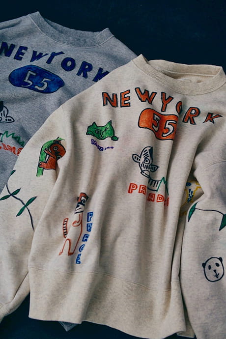 アートワークのテーマは「動物園と水族館」。アメリカンヴィンテージに見られる卒業記念の寄せ書き系アイテムから着想を得て、落書きのような自由さと温かみを表現。ベースがレディース用スウェットであることから、普段のタッチよりも柔らかさと可愛らしさを意識して描かれています。
