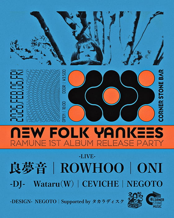 そして、発売当日となる2月6日(金)には、地元・大阪の南堀江にある『CORNER STONE BAR』でリリースイベントも開催!FUJIROCKFESTIVAL等への出演でも知られるROWHOO、さらにはONI(あふりらんぽ)を迎えた豪華3マンライブという内容でお届け。