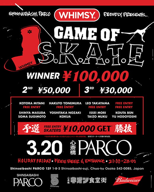 そんなオールナイトイベント前の21時からは、12Fの吹き抜けフロアで、大阪発のソックスブランド<WHIMSY>とコラボしたスケートボードイベントも!!KOTORA MITANIやHAKUTO YONEMURA、LEO TAKAYAMAといった人気スケーターたちも参戦し、当日の予選はフリーエントリーもOK!優勝賞金10万円をかけた白熱のスケートゲームが繰り広げられるから、要CHECKです!!