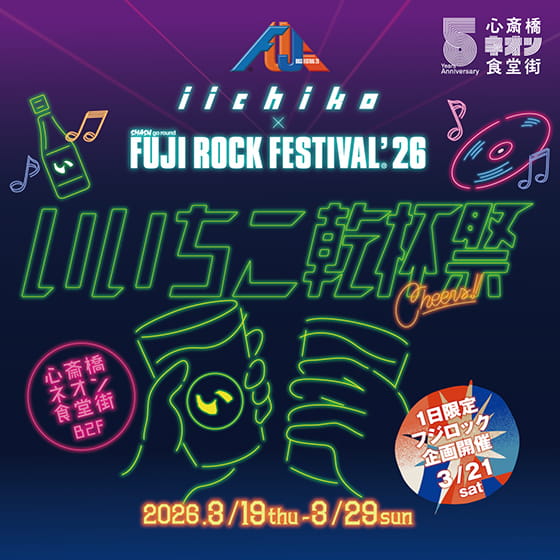 焼酎ブランド・iichikoとFUJI ROCK FESTIVALがコラボした「いいちこ乾杯祭」も3月19日(木)からスタート!B2Fの対象店舗でいいちこを注文すると、フジロックでもお馴染みの1.15秒(いいちこ)にピタリと止めてオリジナルマドラーをゲットできる「いいちこチャレンジ」に参加できます。3月21日(土)には、いいちこを片手に今年のフジロックについて語り合うトークイベント(14時30分から)やPOP UPイベントも!!