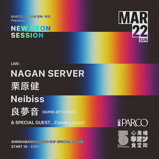 3月22日(日)には、『心斎橋ネオン食堂街』5周年ビジュアルにモデルとして登場したNAGAN SERVER、ratiff(Neibiss)、良夢音(SUPER JET KINOKO)によるスペシャルライブ「NEW NEON SESSION」も開催!