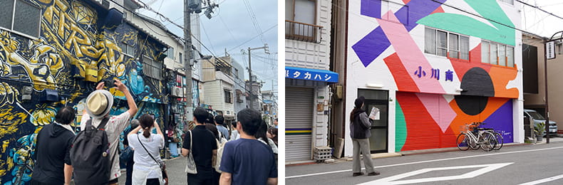 WALL SHAREが拠点を置く大阪市此花区は、エンターテインメントと下町情緒が同居するエリア。古き良き長屋や人情味あふれる商店街が今も息づくまちです。洗濯物が揺れる軒先や、夕飯の香りが漂う路地。そんな日常のすぐ隣に、世界各国のアーティストが魂を込めた37作品が存在しています。万博後の近代的なベイエリアとは対照的な、レトロで静かな散策が楽しめるんです。
