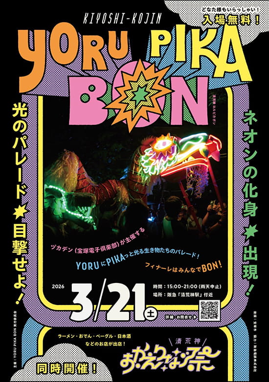 いろんなイベントで強烈なインパクトを残し続ける電子工作ユニット・ヅカデン(宝塚電子倶楽部)が、またまた楽しいことを企画!今度は彼らの拠点である阪急宝塚線の清荒神駅周辺を舞台に、あのネオンの化身が登場したり、YORUにPIKAっと光る生き物たちのパレードがあったりという、ヅカデンらしさ全開のイベントです。