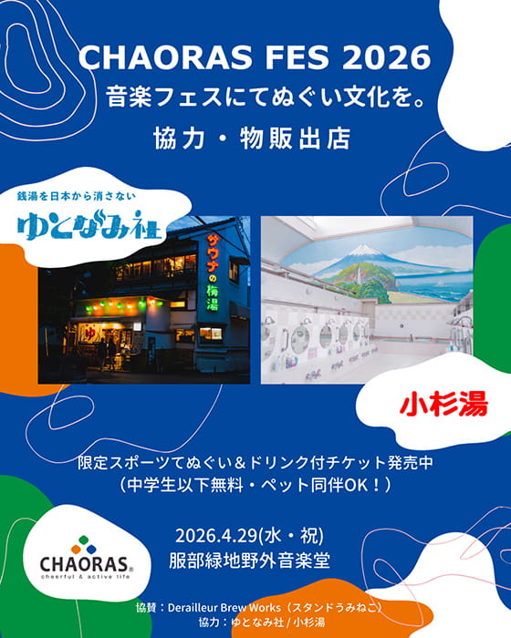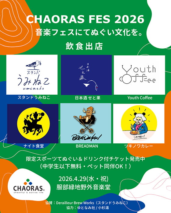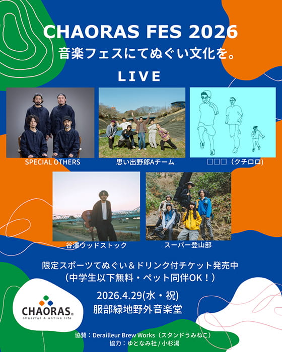 しかも「CHAORAS FES 2026」では、入場チケットにてぬぐいが付いてくるんです!当日は、そのてぬぐいを巻いたり、使ったり、振り回したり、そんな楽しげな光景があふれているはず!4月29日(水・祝)開催の「CHAORAS FES 2026」、チケットはお早めに!!