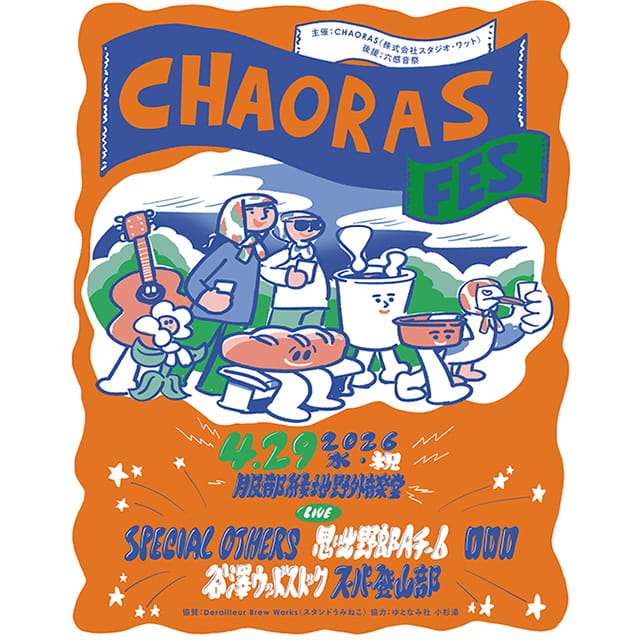 そんなCHAORASが、4月29日(水・祝)に服部緑地野外音楽堂で初の音楽フェスを開催!これまでの想いと経験を結集させた「CHAORAS FES 2026」は、出演アーティストもNICEなラインナップになっています。SPECIAL OTHERS、思い出野郎Aチーム、ロロロ、谷澤ウッドストック、スーパー登山部という、フェスの気持ちよさをさらに加速させてくれる面々です。