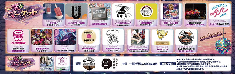 ICE-UP 淡路島氷菓 / Uppocole / team癖クラ / NORI SHOP帆もり / サモハンマーケット / うちゅうせんかんぷらたん / AHSO a.k.a ヅカデン / てぬぐいCHILL / クレイジーメダカ / ちくわ屋書店 / 平日中華 休日中華 / アトリエスタ / WAKUWAKU / INCLINE / conoco / 流しのこたつ / 毎日どこかがダンスホール