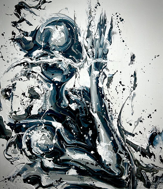1986年生まれ、大阪府出身、神奈川県川崎市在住。森田学は、「人のシルエット」を通して感情の揺らぎを描くアーティストです。海外の想像から描かれる日本の文化や光の表現、そして独自の進化を遂げた日本のストリートカルチャーに見られる視覚的な解釈は、現実とは異なる距離感を持ちながらも、強い魅力を放っています。そうした“外部の視点によって再構築された日本像”をインスピレーション源とし、作品の中で再び組み替えています。作品に現れる人のシルエットは、特定の意味を持たず、鑑賞者の記憶や感情と重なりながら変化する存在であり、その曖昧さやわずかな違和感は、視界に小さな引っかかりを残し、見る者の内側にある感情を静かに揺らします。その一瞬の引っかかりが、静かな対話を生むのです。