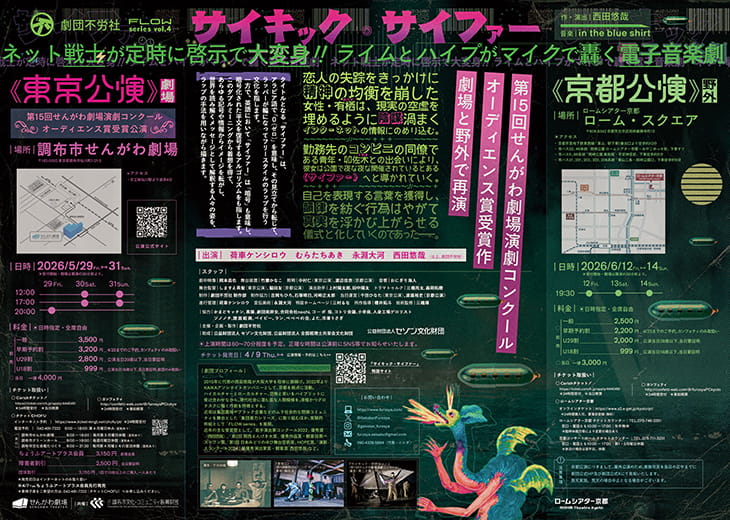 音楽を手がけるのは、京都拠点で注目を集めるin the blue shirt。サンプリングを駆使した疾走感あるサウンドと、舞台上で繰り広げられるライムとハイプが重なり合い、演劇とライブのあいだを行き来するような体験に。劇団不労社らしい、グロテスクさとユーモアが同居する世界観も見どころのひとつ。今回は劇場だけでなく、ローム・スクエアでの屋外上演というロケーションもユニーク。初夏の夜に、言葉とビートが響く少し異質な舞台体験を味わってみては。